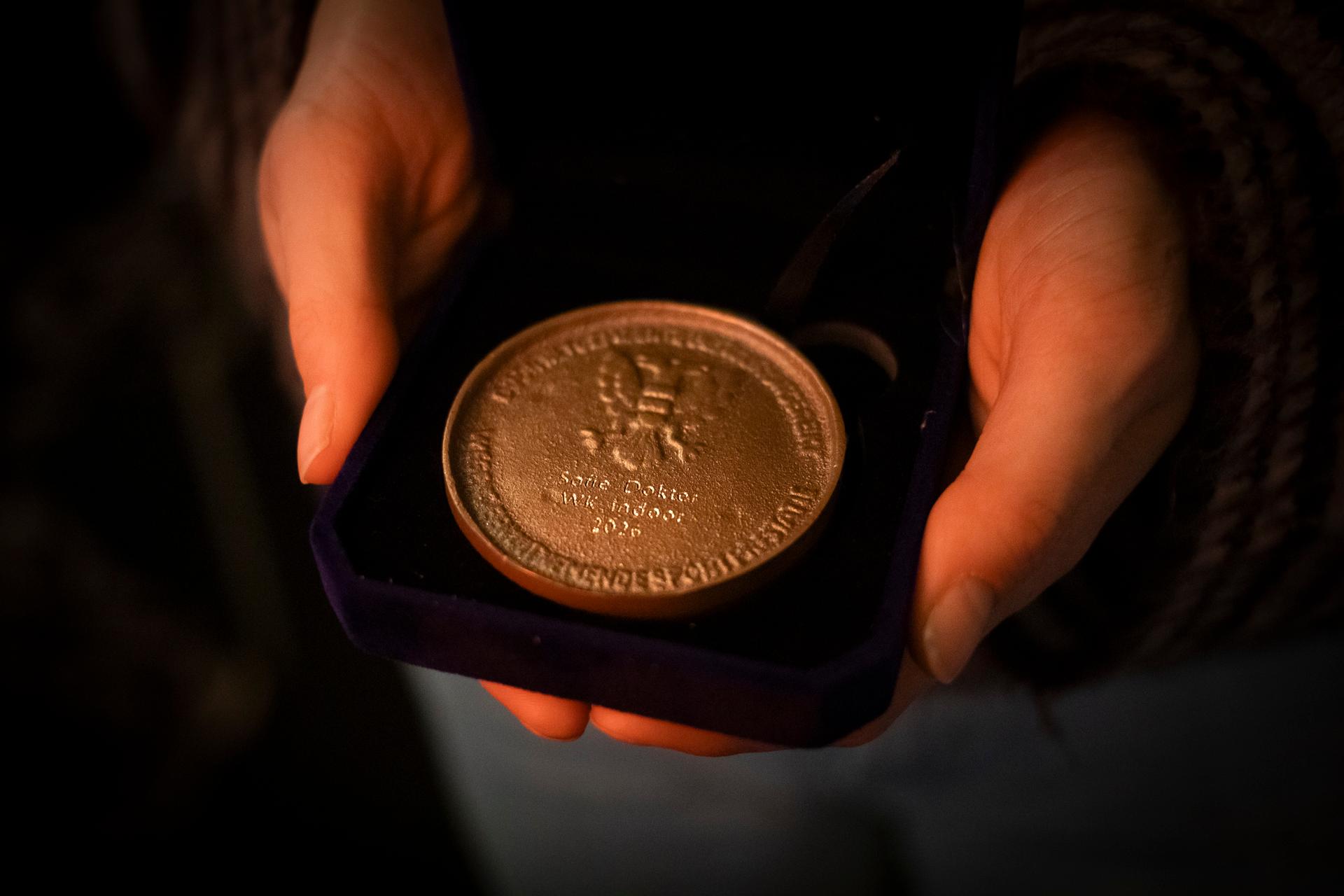 Vanavond werd topsporter Sofie Dokter, die net terug is in Groningen, verrast met een gouden sportpenning door wethouder Inge Jongman. Daarmee eert de gemeente haar bijzondere prestatie: Sofie is wereldkampioen indooratletiek geworden op de meerkamp.