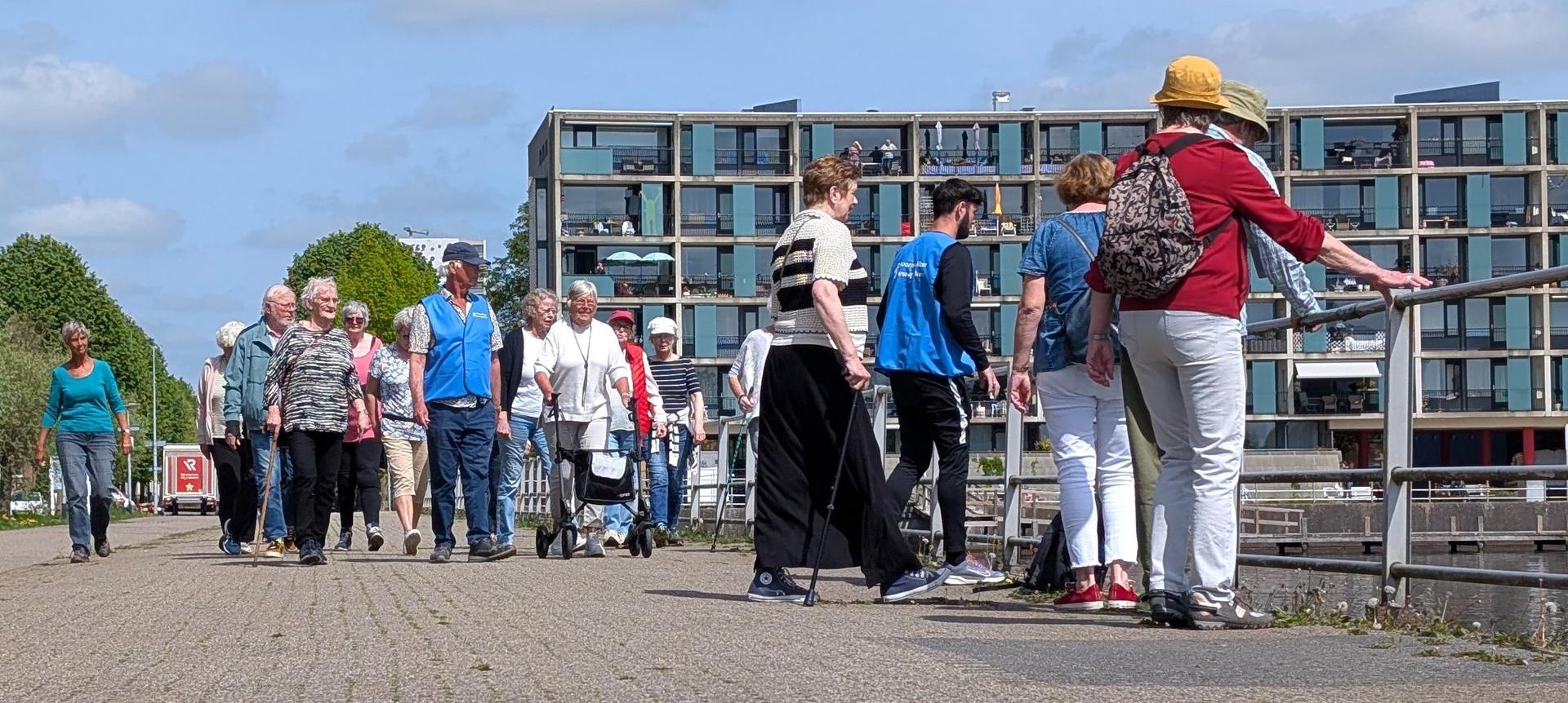 Een wandel- en beweegactiviteit. Een uurtje per week (elke dinsdag, 13:00) samen (rustig aan) wandelen. Bij de start even wat eenvoudige oefeningen om 'op te starten' en ter afwisseling onderweg op enkele plekken ter afwisseling wat andere oefeningen om ook andere spiergroepen "wakker te schudden'.